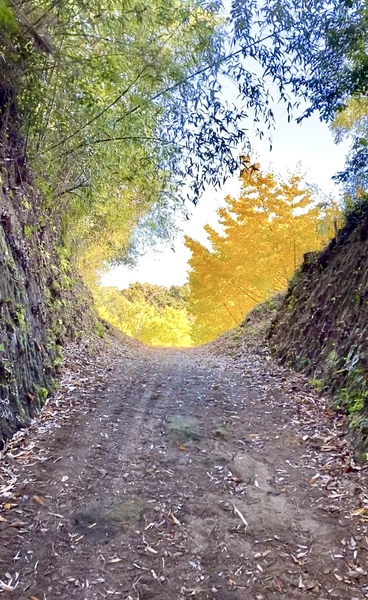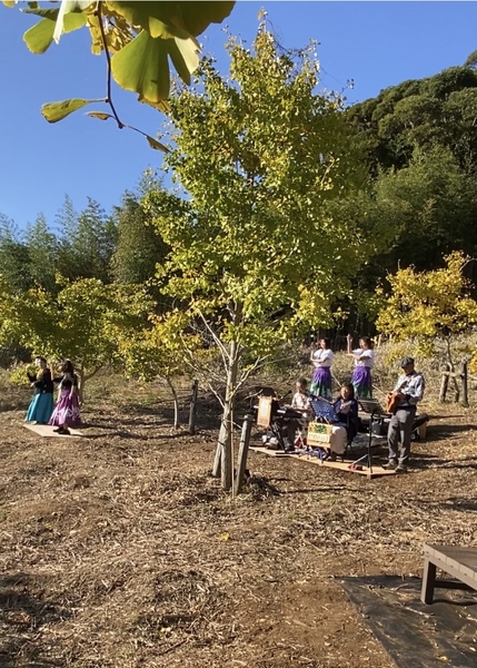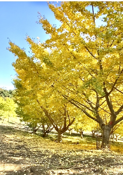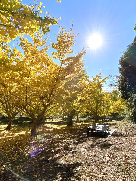 11月22日現在のとうしろ台城跡、イチョウの黄葉の様子です。急勾配の坂道の頂上に着くと、黄金に輝くイチョウがお迎えします。写メスポットです。頂上から右側の黄葉の様子で、青空とのコントラストが見事です。寄贈いただいたウッドデッキは大活躍しています。黄色の落ち葉絨毯も輝いています。11月24日には、青空のもとで黄葉と音楽を楽しもうと、生バンドによるハワイアン演奏、フラダンス、ウクレレ演奏などをお試しイベントとして行いました。約50人の方々が訪城し黄葉とともに演奏やダンスを楽しみました。