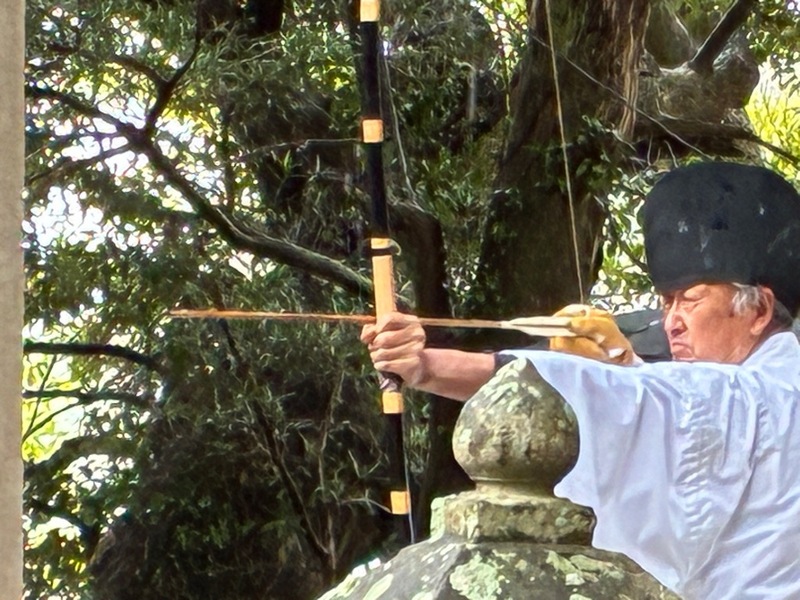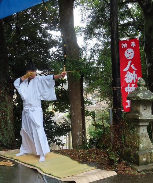 南房総市民俗文化財に指定されている「安馬谷八幡神社の御神的神事」が、3月3日に行われました。矢の的中具合で今年の稲作の豊凶を占う神事です。地元安馬谷区区長代理の川名勝德さんが射手を務め、9本の矢を放った結果早生と中生は七分で平年並み、晩生は八分で豊作となりました。【投稿者 丸山地域づくり支援員 maruyama.kyodo@city.minamiboso.lg.jp】