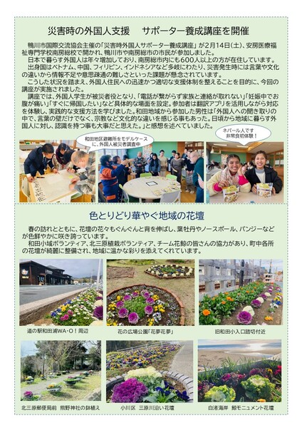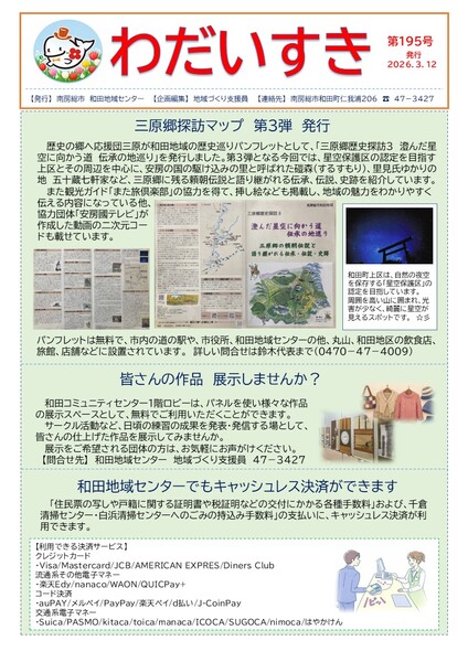 和田地区のボランティア団体の活動紹介や、地域の情報などをお知らせする「わだいすき195号」を発行しました。今号では、歴史の郷へ応援団三原が発行した「三原郷探訪マップ」や安房医療福祉専門学校で行なわれた災害時外国人サポーター講座、和田地域の花壇で咲く花の様子などを掲載しています。 どうぞ、ご覧ください。
