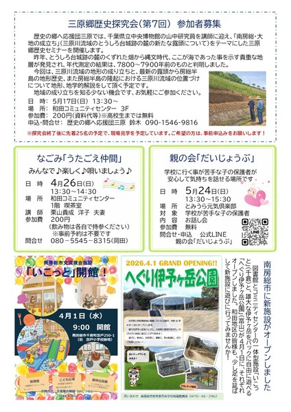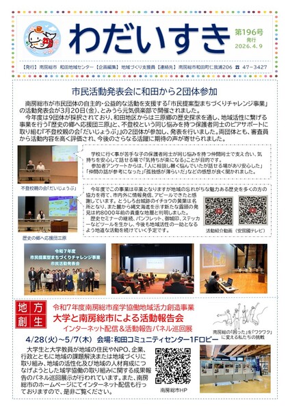 和田地区のボランティア団体の活動紹介や、地域の情報などをお知らせする「わだいすき196号」を発行しました。今号では、とみうら元気倶楽部で開催された市民活動発表会の様子や、市民団体主催のイベント開催案内、市内新施設オープンのお知らせを掲載しています。 どうぞ、ご覧ください。