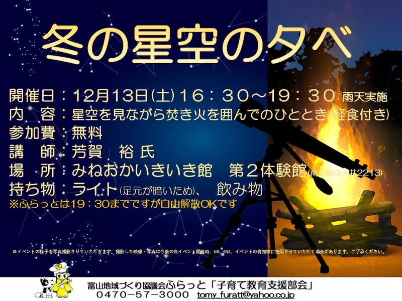 ふらっと「子育て教育支援部会イベント!12/13(土)16:30~焚き火を囲みながらの天体観測、焼き芋(もしくはふかし芋)&スープであったりながらの冬の星空の夕べを開催します。天候によっては、屋内で暖をとりながらオリオン座や星雲などの解説、星座の神話や地域の昔話など。お芋を食べながら皆さんで宇宙と地域のお話をしましょう☆丸山の美しい夜空のもとで開催します♪お問合せ・申込み富山地域づくり協議会ふらっと「子育て教育支援部会」0470-57-3000