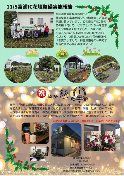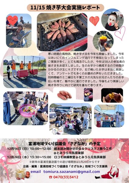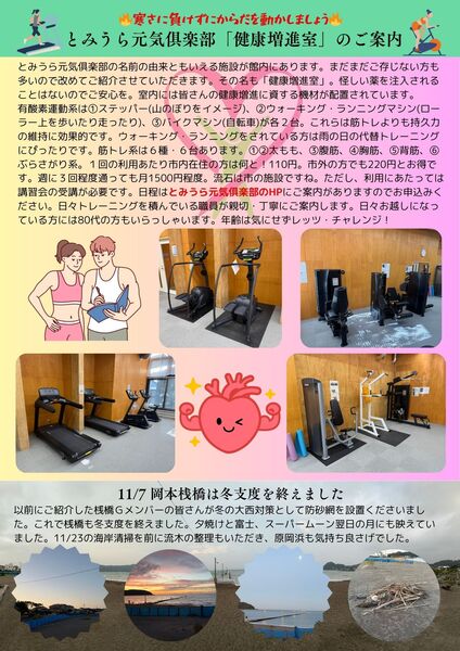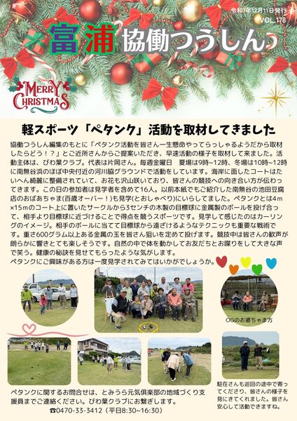 トップページでは、軽スポーツ『ペタンク』の活動をご紹介。P2では、富浦IC花壇整備のご報告等を掲載。P3では、とみうら元気倶楽部『健康増進室』を掘り下げ!P4では、11月15日に開催された『焼いも大会』の実施レポートなど今号もボリューム満載でお届けします!