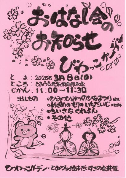 【とみうら絵本だいすきの会】おはなし会のお知らせ日時:3月8日(日)11時~11時30分場所:とみうら元気倶楽部 和室とみうら絵本だいすきの会では、毎月第2日曜日にとみうら元気倶楽部にて絵本の読み聞かせを開催しています。今月はひなまつりのお話もあります。ぜひ遊びに来てくださいね!待ってるよ~(^^)/【今月の出し物】🌸絵本『ひみつひみつのひなまつり』🌸大型絵本『めざめのもりのいちだいじ』🌸『ちいさなくれよん』他