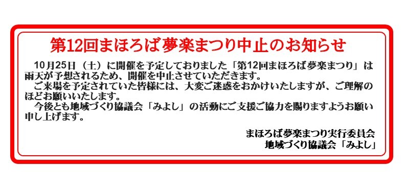 10月25日(土)に開催を予定しておりました「第12回まほろば夢楽まつり」は雨天が予想されるため、開催を中止させていただきます。