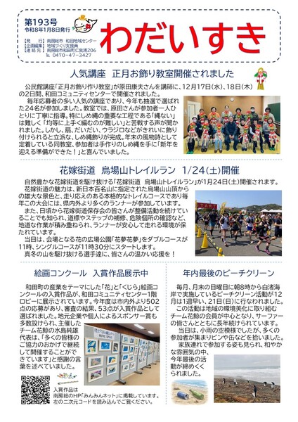 和田地区のボランティア団体の活動紹介や、地域の情報などをお知らせする「わだいすき193号」を発行しました。今号では、お飾り作り教室、老人クラブ演芸会、ビーチクリーン活動などの様子、今後開催されるイベントなどのご案内を掲載しています。 どうぞ、ご覧ください。