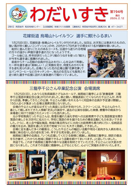 和田地区のボランティア団体の活動紹介や、地域の情報などをお知らせする「わだいすき194号」を発行しました。今号では、花嫁街道烏場山トレイルラン、三龍亭千公さん卒業公演、歴史の郷へ応援団三原の感謝状贈呈式、なごみうたごえ仲間参加者募集などについて、掲載しています。 どうぞ、ご覧ください。