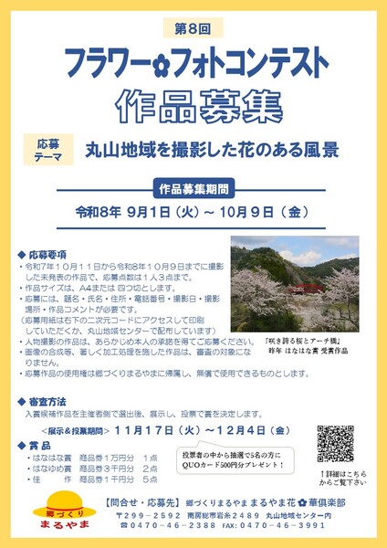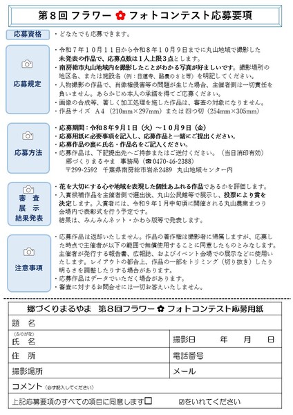 どなたでも応募できます。令和7年10月11日から令和8年10月9日までに丸山地域で撮影した未発表の作品で、応募点数は一人上限3点とします。