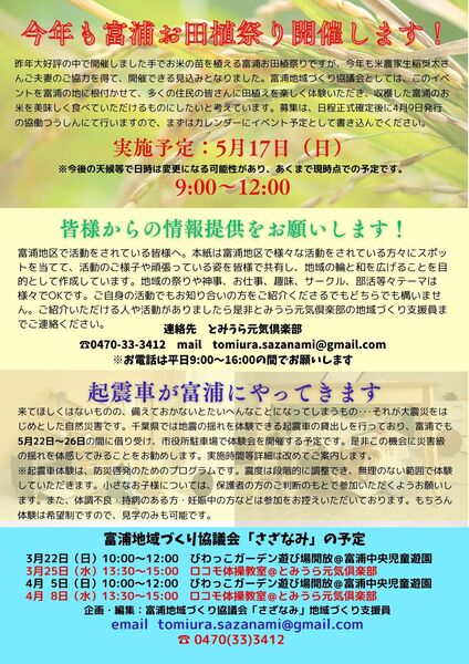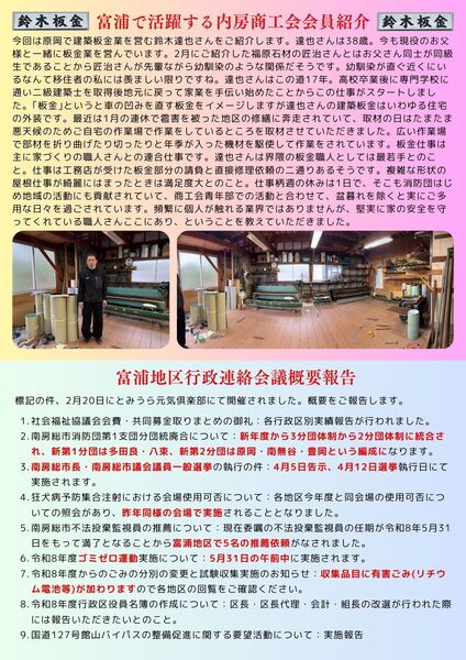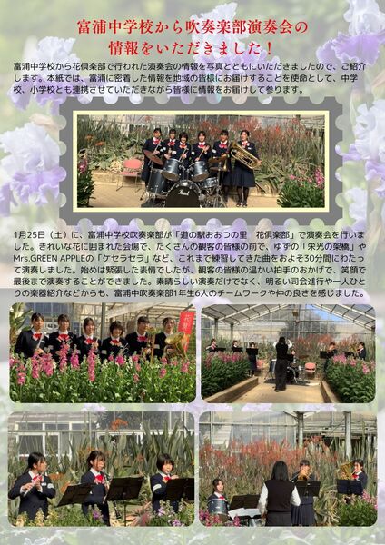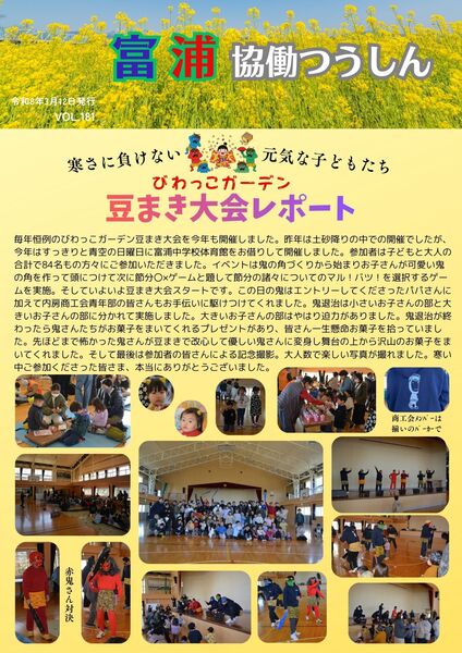 トップページでは、2月1日(日)に開催された『びわっこガーデン豆まき大会』レポートを掲載P2では、道の駅おおつの里花倶楽部で行われた富浦中学校吹奏楽部演奏会の様子をお届け!P3では、富浦で活躍する内房商工会会員のご紹介と、富浦地区行政連絡会議概要のご報告P4では、今後のイベントについてご案内今号もボリュームたっぷり!お楽しみに!!